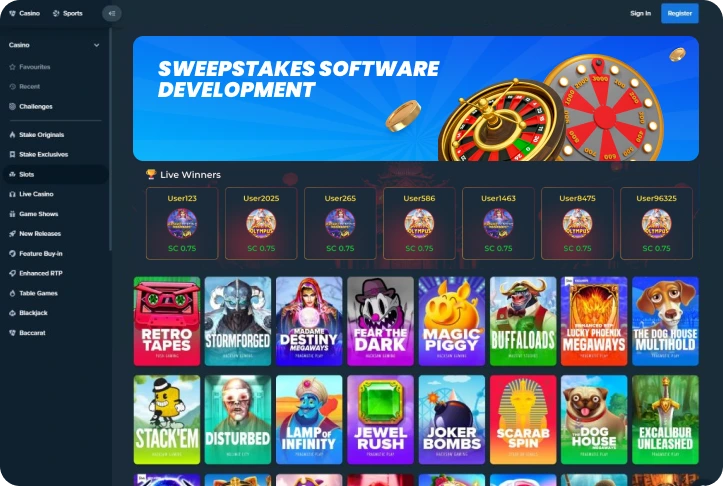 A legally compliant sweepstakes casino solution utilizing dual-currency models (Gold Coins & Sweeps) to enter restricted markets like the United States.